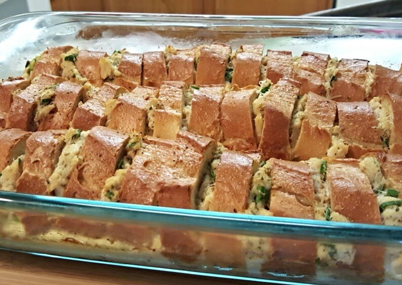- Slice baguette into 3/4 inch slices and butter each side. Stand slices in baking dish and tuck crab mixture between each piece of bread.