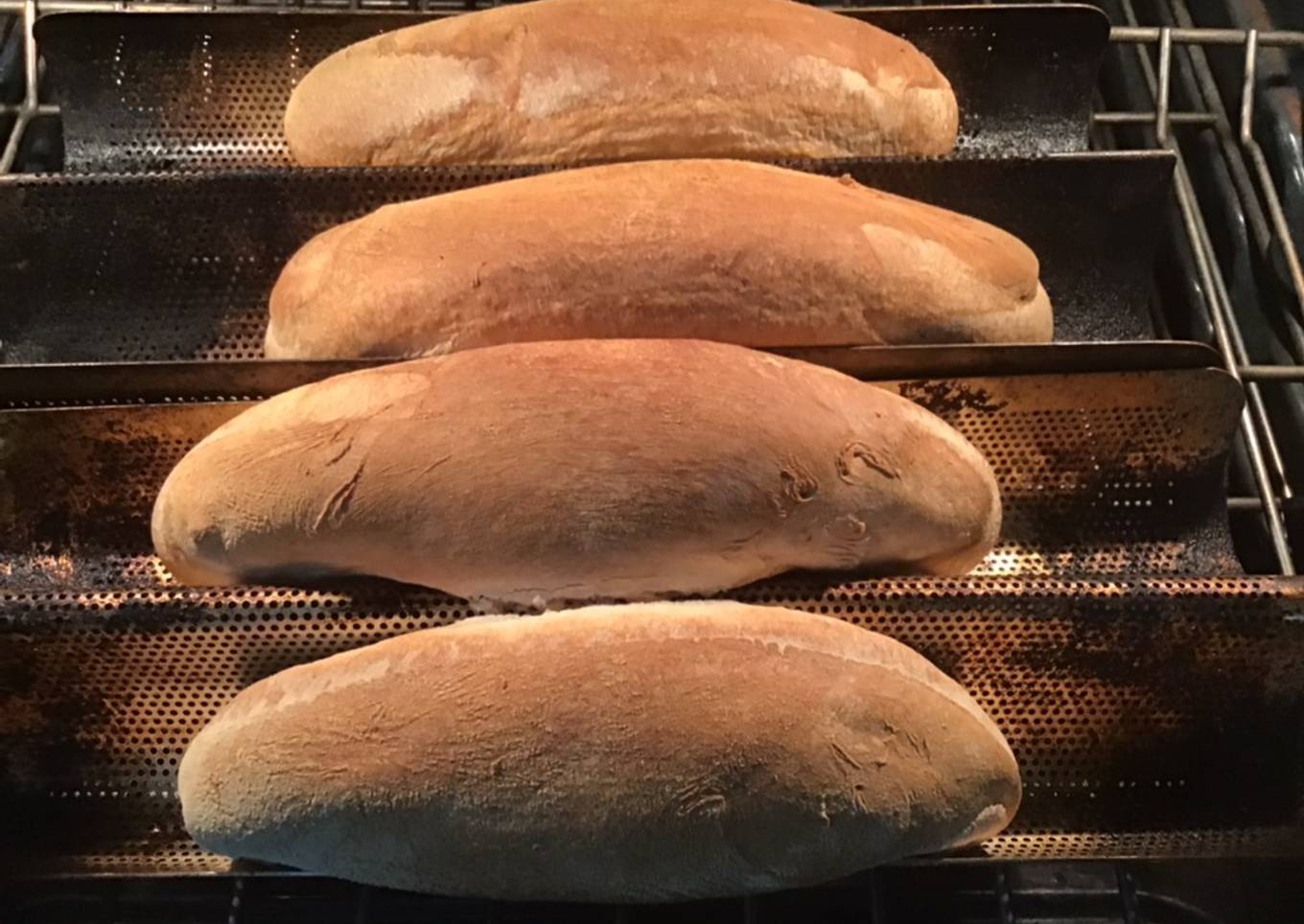 Water, flour, sourdough starter and a pinch of salt, the classic way to bake bread. We bake four french rolls of sourdough bread a week, either white sourdough bread or wheat sourdough bread.