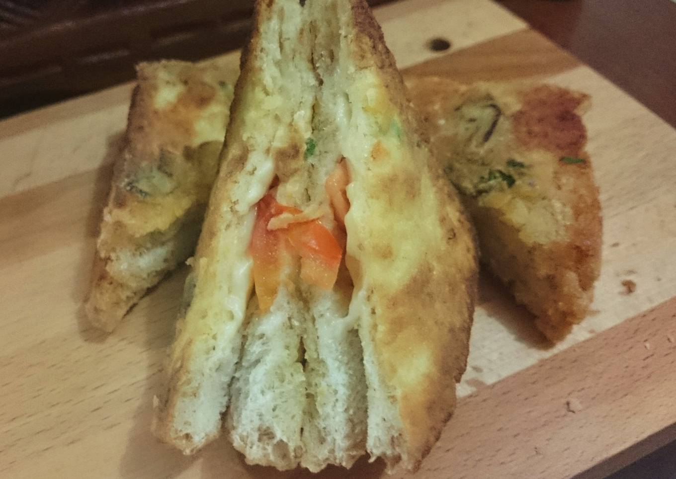 - Put the cheese and tomato-slices in between of 2 breads, then cut it into 4