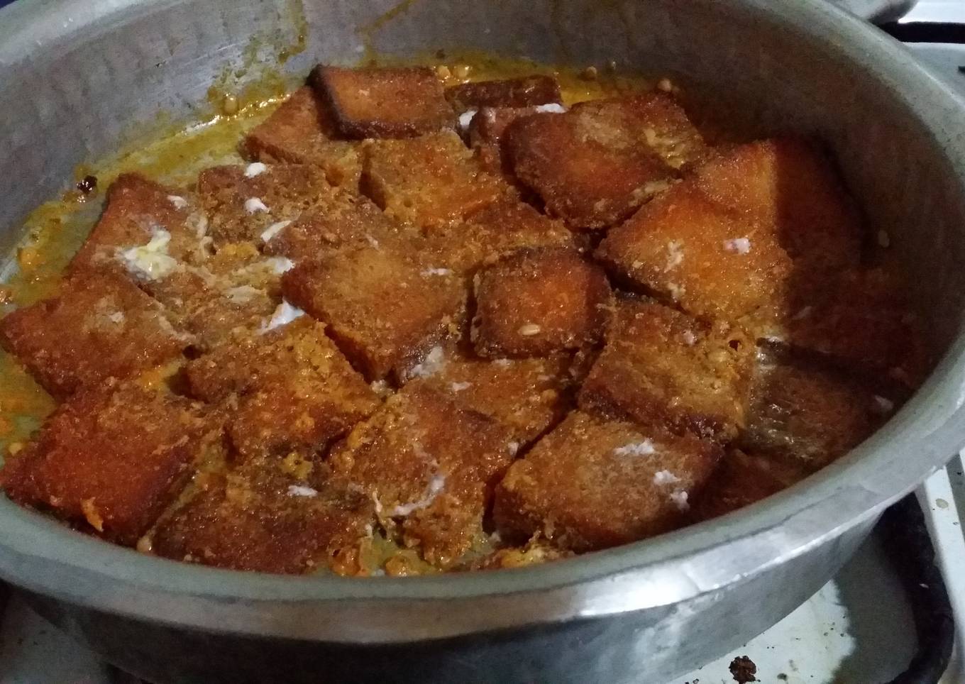 - Assemble the fried bread cubes in the pan and cover with a lid and put on low flame till the bread absorbs the sugar and milk syrup
