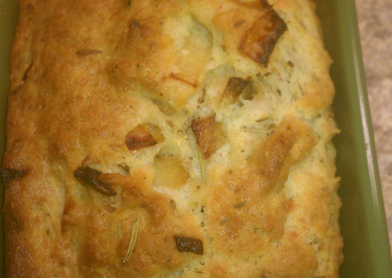 - Separately, whisk together flour, parmesan, sugar, rosemary, thyme, baking powder, lemon zest, salt, pepper and baking soda; add the onions.