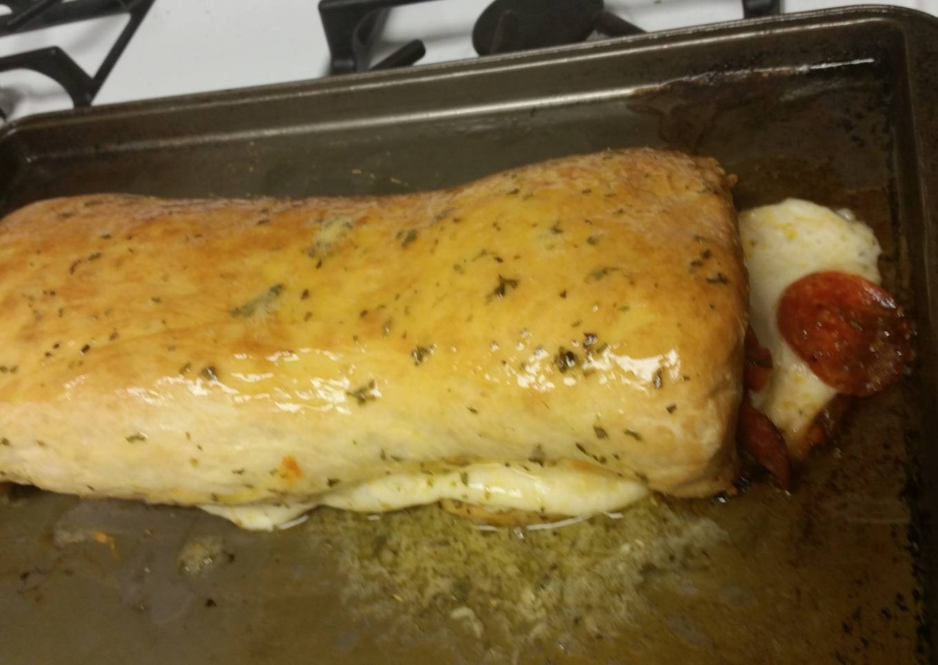 - Roll up rectangle, jelly roll fashion, starting at one long side. Pinch seam & ends to seal, but you don't have to pick closed. Place roll, seam side down, on baking sheet.