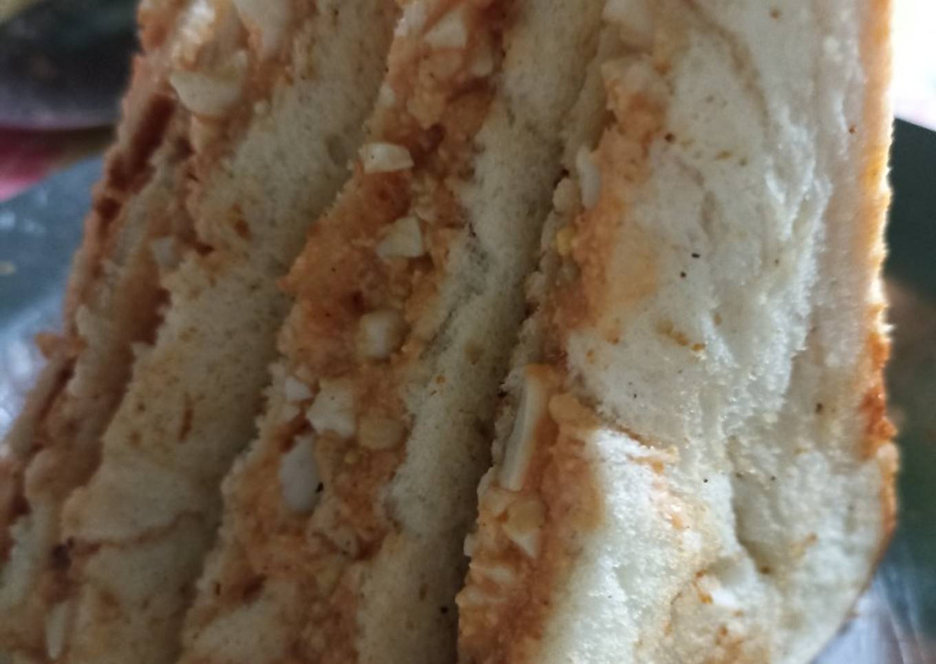 - Now spread the egg filling on the buttered side of the bread slice and use another buttered slice and sandwich it.