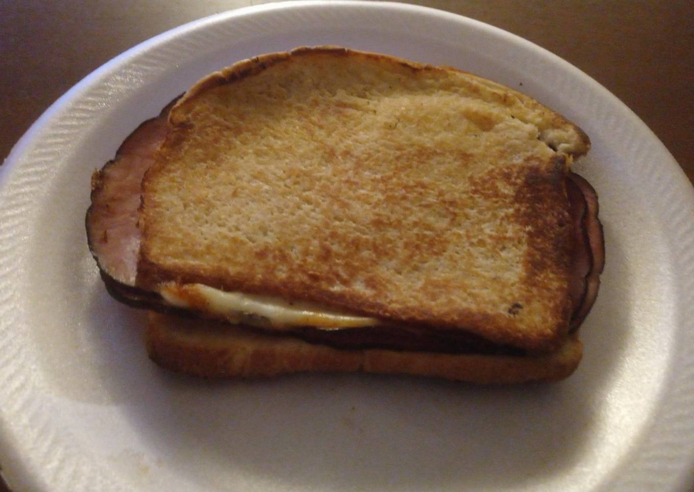 - Bring a skillet to medium low heat. Add a slice of bread butter side down. Add a slice of cheese then both slices of ham and top with last slice of cheese. Add the other slice of bread butter side up. Cook till the one side is golden brown and cheese is melted. Flip and do the other side the same way.