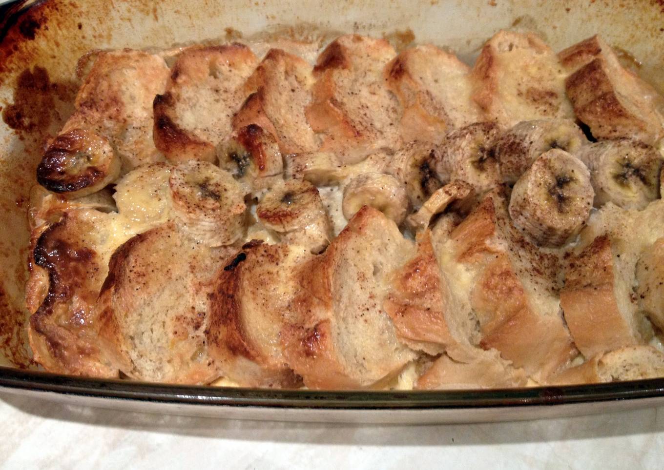 - slice the french bread and butter the slices. Slice the bananas. Arrange the bread and bananas in the baking dish.